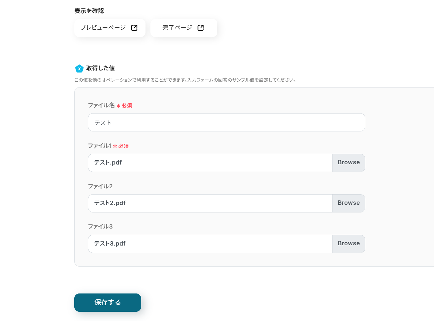 取得した値には、以下の画像のようにテストで使用するPDFやファイル名を設定しておきましょう。