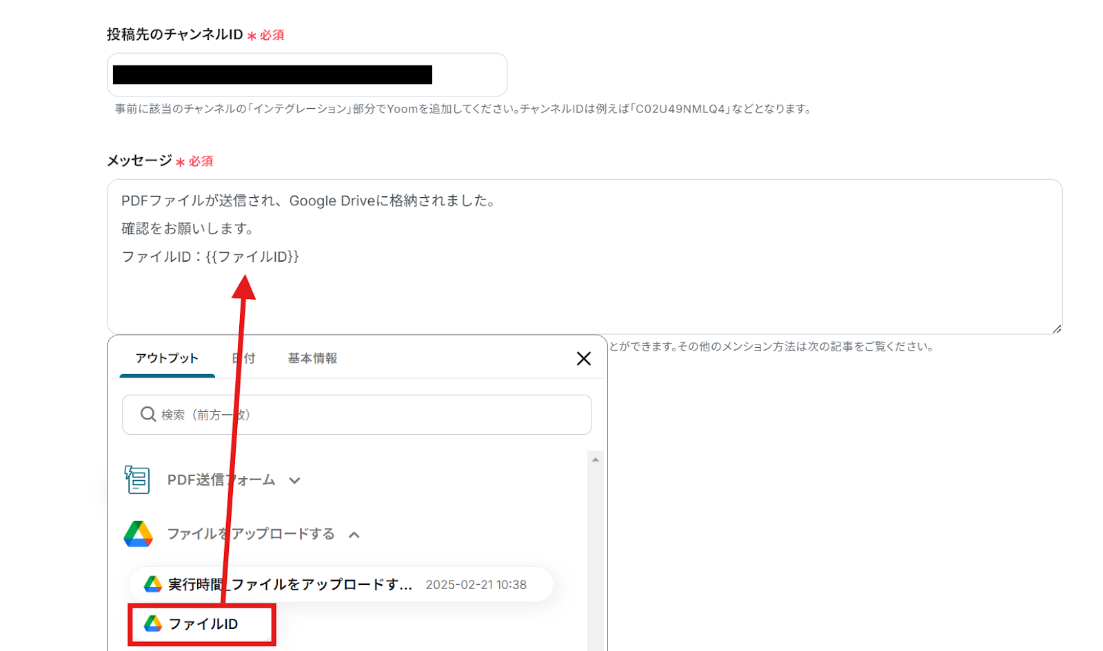 2.Google Driveの時と同じように、Slackと連携するアカウント情報などを設定したら、投稿先のチャンネルIDとメッセージを設定していきます。