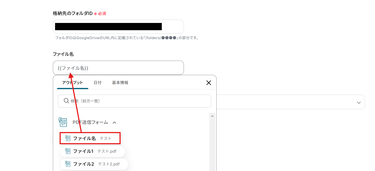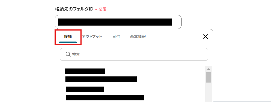 格納先のフォルダIDは入力欄をクリックすると以下の画像のように候補が表示されるので、その中から選択してください。