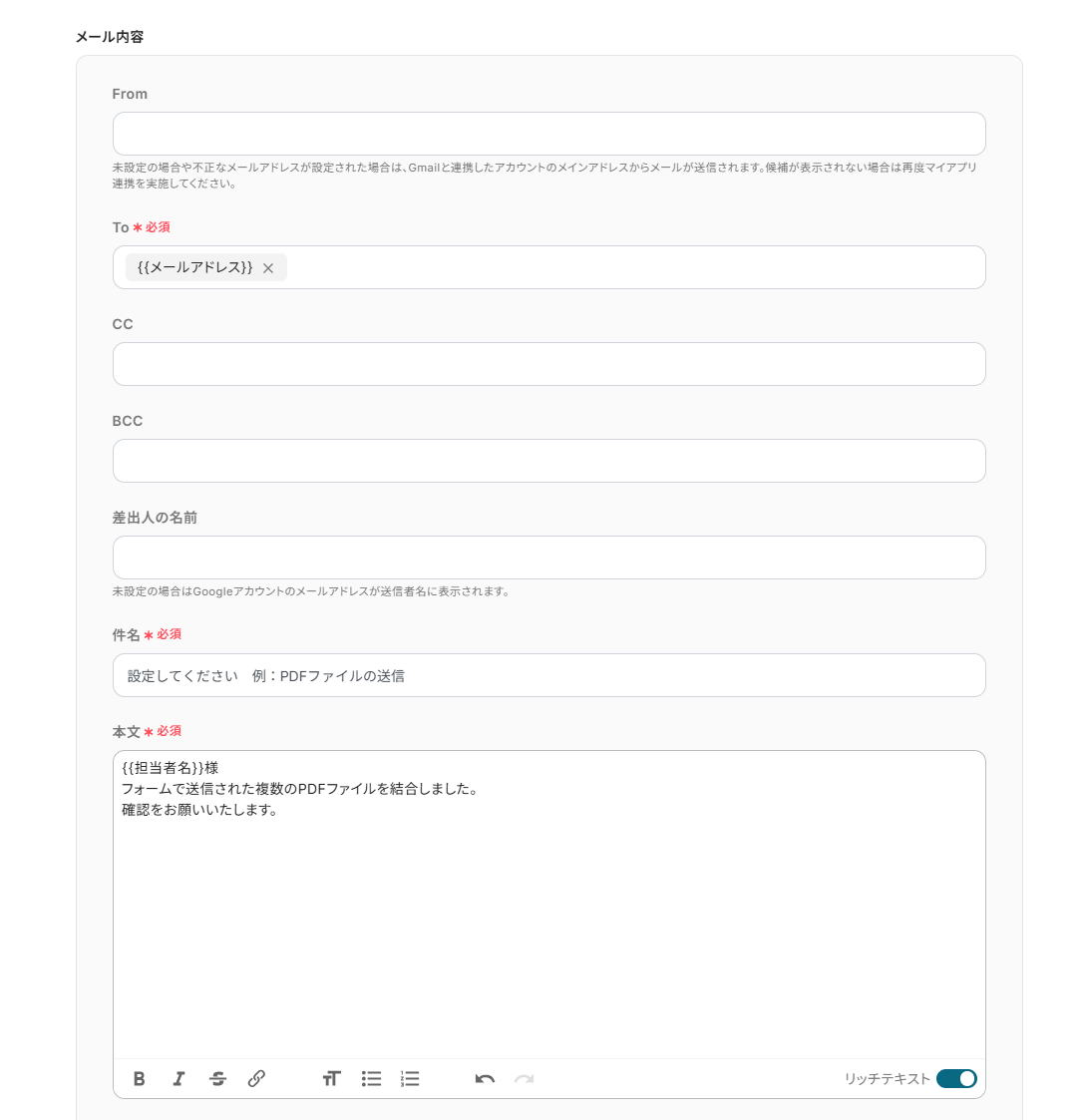 2.Gmailと連携するアカウント情報などを設定したら、メール内容を設定しましょう。