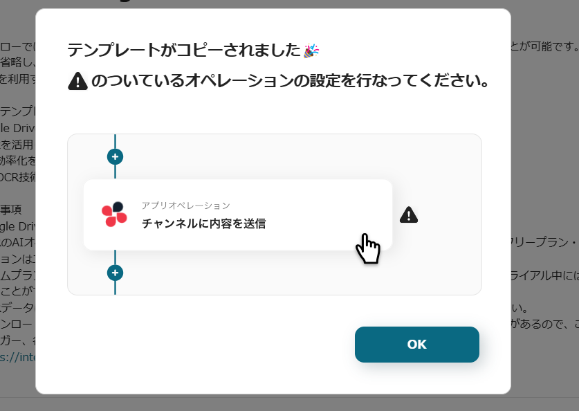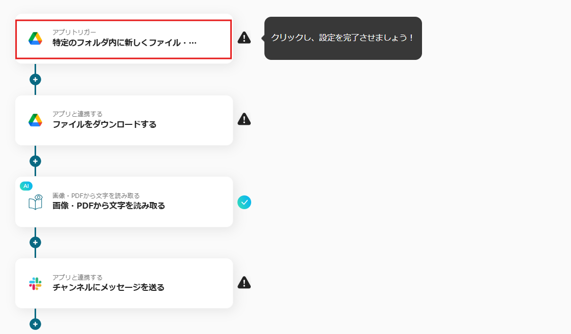 このフローでは、Google Drive内のPDFファイルからテキストを抽出し、その内容を自動でSlackに共有することが可能です。この自動化によって、手動でのテキスト抽出や通知作業を省略し、効率的な情報共有を実現します。