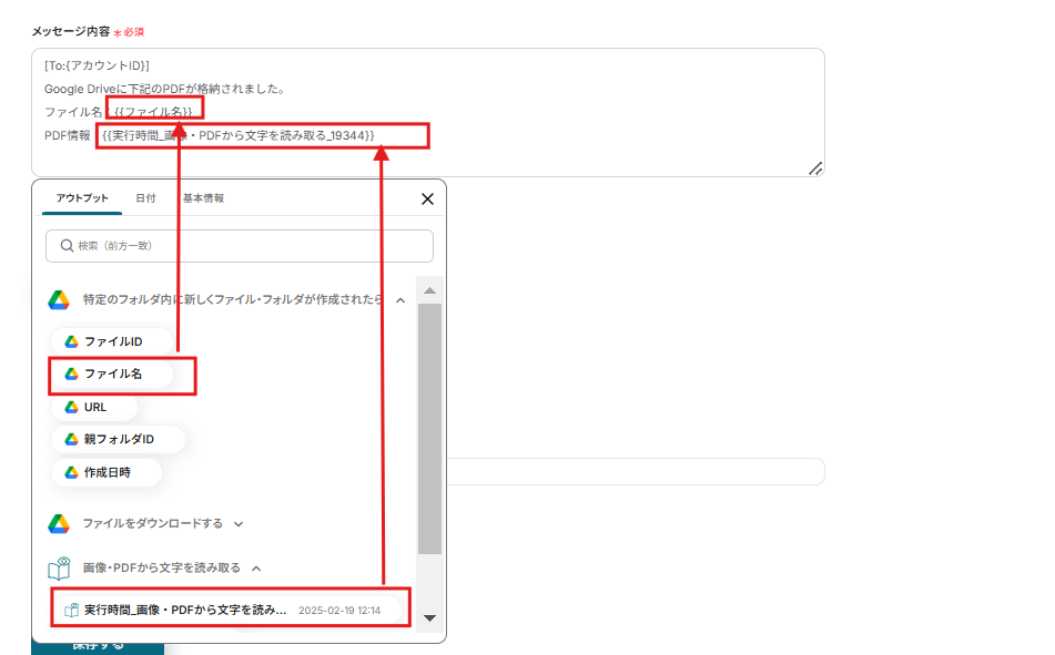 ファイルIDはアウトプットから選択してください。