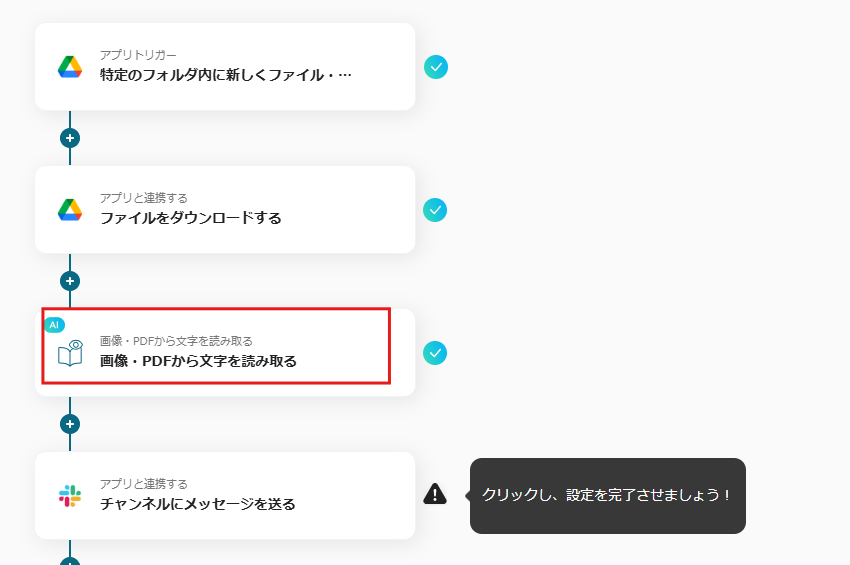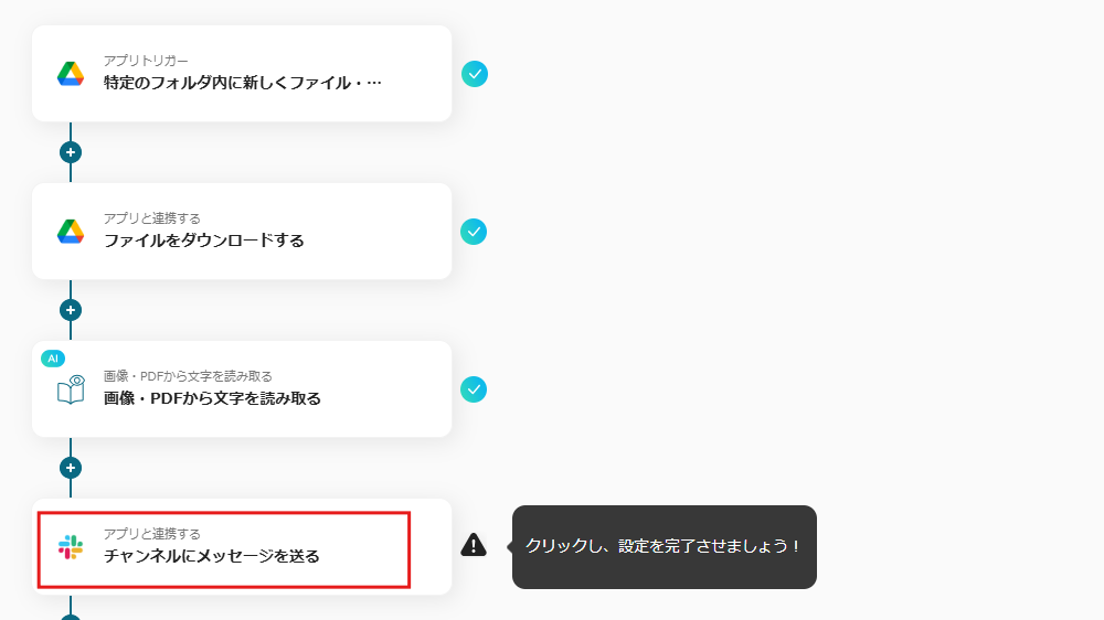 これを設定すれば、新しく追加されたPDFのテキストを自動で抽出し、指定のSlackチャンネルへ通知してくれます。今まで手間に感じてた手作業が減るため、業務のスピードもアップできちゃいますよ!