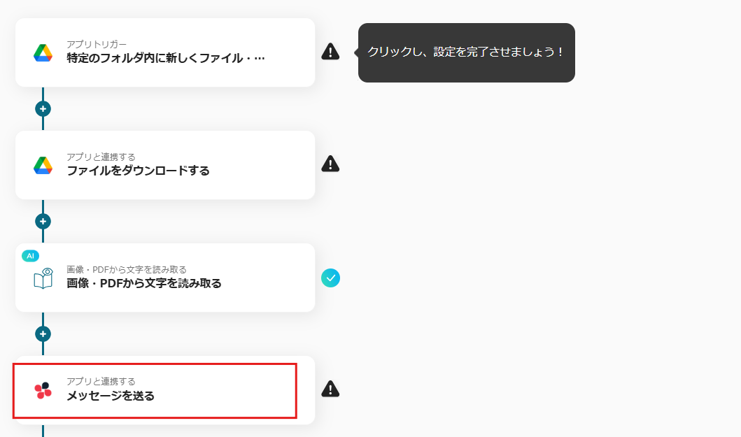このフローでは、Google Drive内のPDFファイルからテキストを自動で抽出し、その内容をChatworkに通知することが可能です。この自動化により、手間なく必要な情報をチームと共有でき、業務効率が向上するでしょう。
