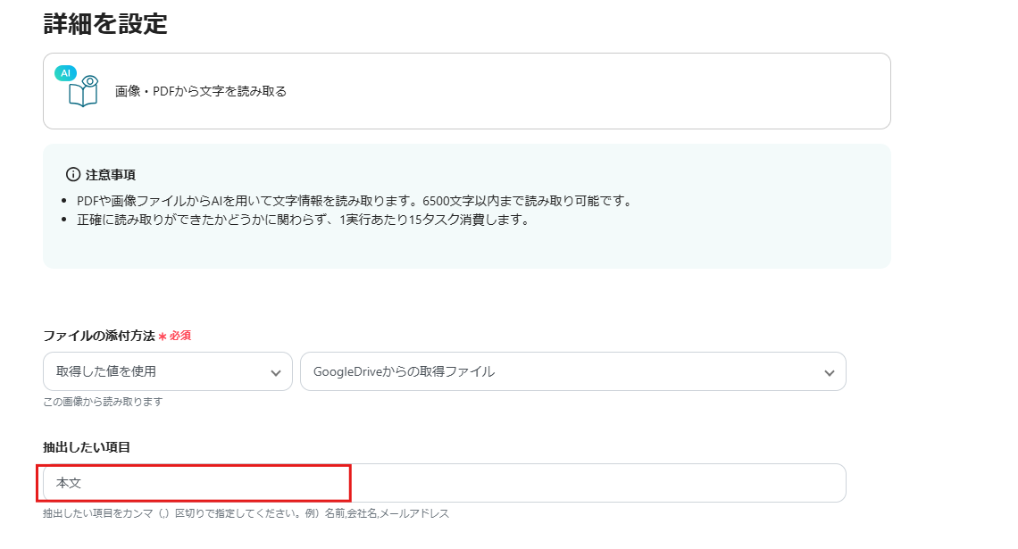 抽出したい項目は「本文」と入力すれ、本文が全て抽出されます。