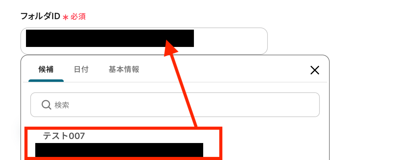 次に、フォルダIDのフィールドをクリックすると既に作成済みのフォルダ候補が出てくるので、連携したいフォルダを選択します。 選択したら連携テストを行います。「テスト」をクリックしましょう。