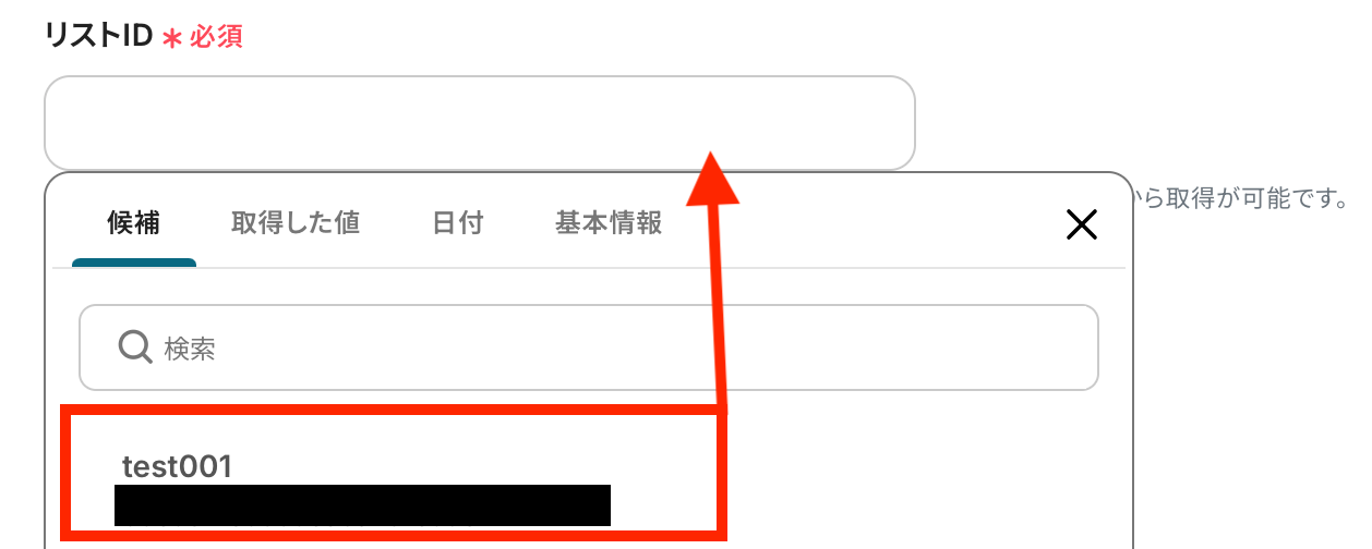 リストID:枠内をクリックし表示される候補から選択しましょう。