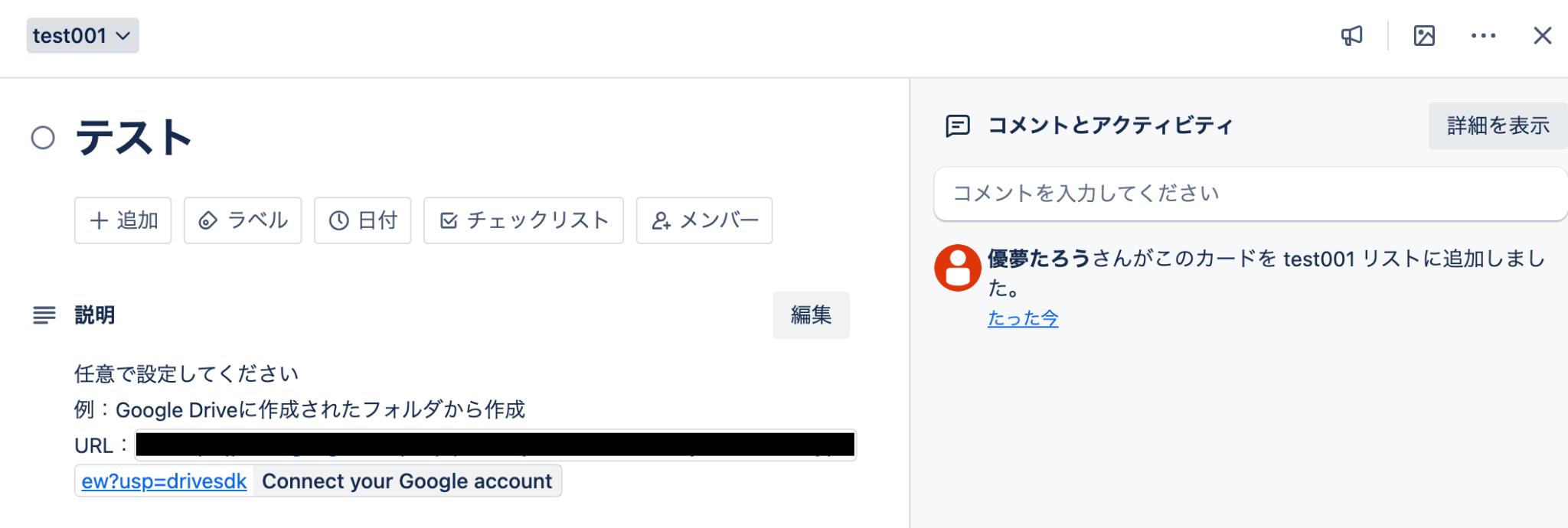 また、カードの説明の箇所にも詳細な補足を追記可能です。 例えば以下のようにURLの取得値を記載することで、Trelloから特定のGoogle Driveのフォルダへアクセスしやすくなります!