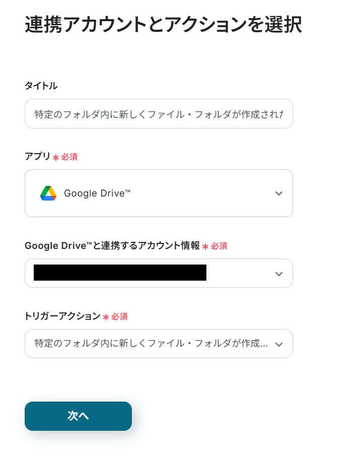 トリガーアクション:Google Driveに新しくファイルやフォルダが作成されたら起動します。