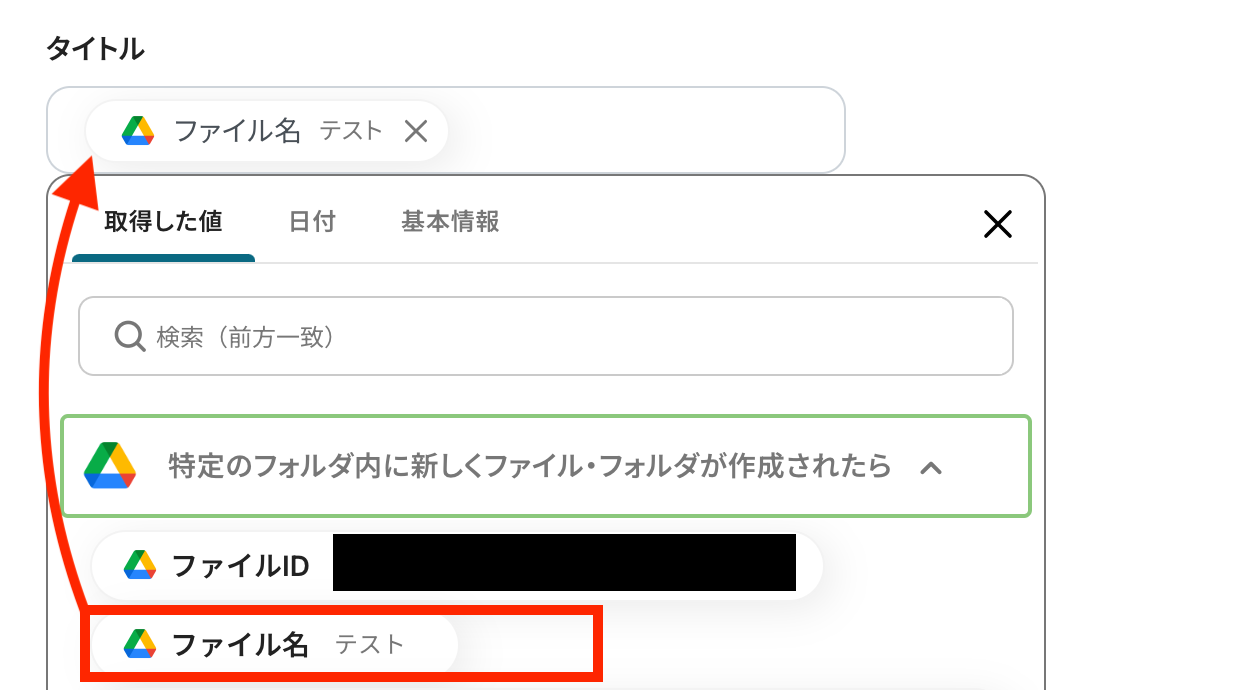 タイトル:1つ前の設定で取得した値を挿入することで、Trelloのカードの「タイトル」に自動で反映することが可能です。今回は下記のようにGoogle Driveのファイル名をタイトルとして選択しました。運用したい内容に合わせて、他の値を活用してもOKです! なお、取得した値は変数となるため、フローが起動する毎に異なるデータとなり、常に最新の値でカードを作成可能です。