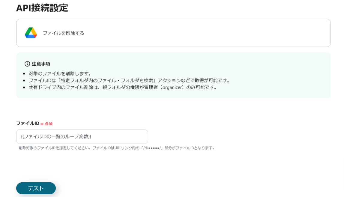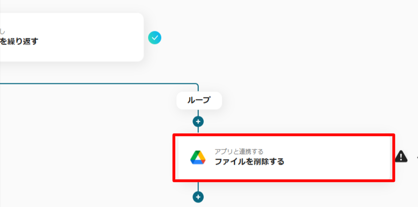 1つ前の設定で取得した「ファイルIDの一覧」に合わせてフローを繰り返す(削除を繰り返す)設定です。