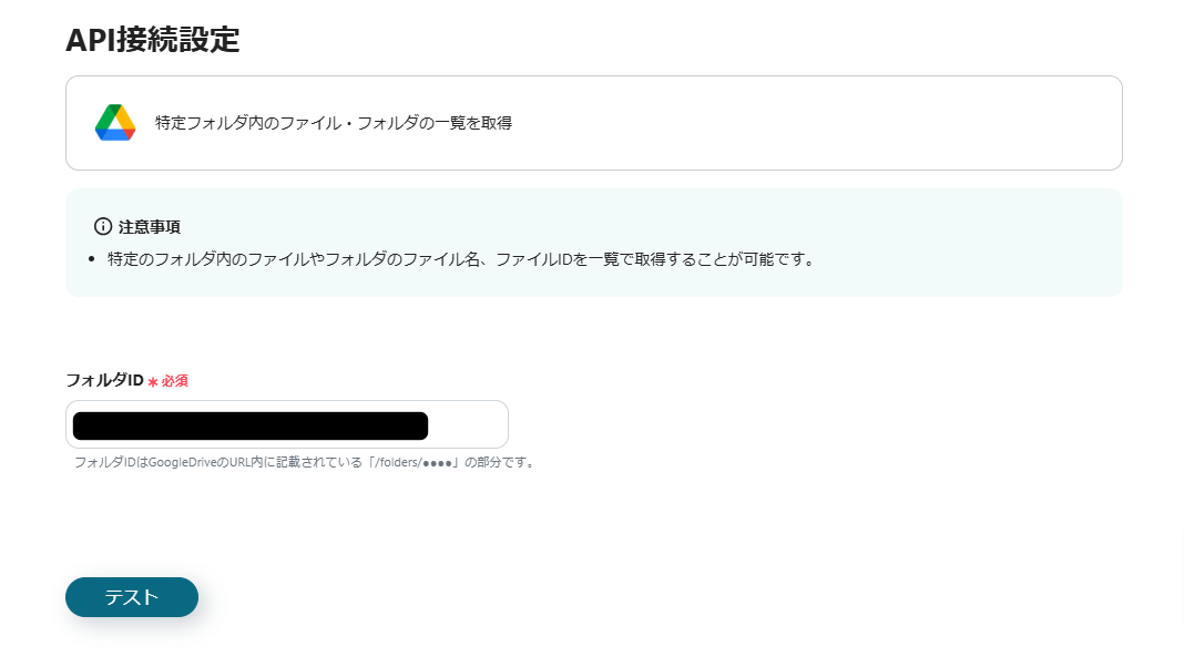 フォルダIDを選択したら「テスト」をクリックしてフォルダ内の情報を取得しましょう。