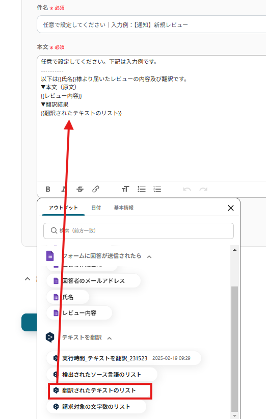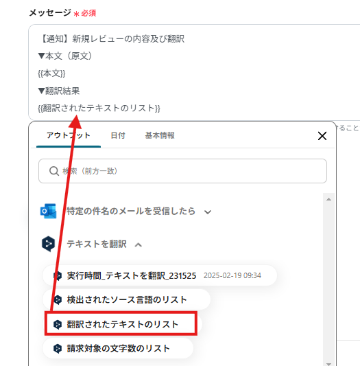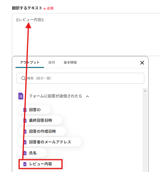 「翻訳するテキスト」は「アウトプット」から、トリガーで取得した情報を入力してください。