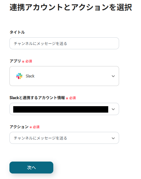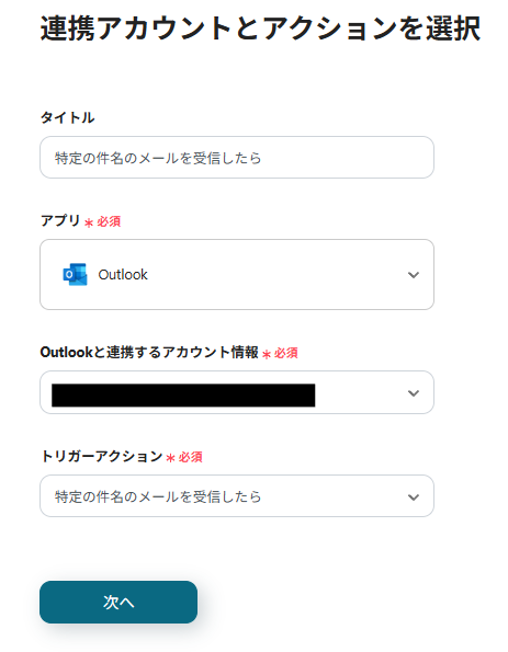 タイトルは自由に変更できますが、トリガーアクションはそのままで「次へ」をクリックしてください。