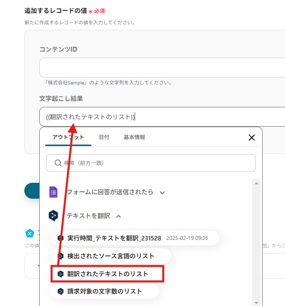 「追加するレコードの値」には「アウトプット」から取得した情報を入力してください。