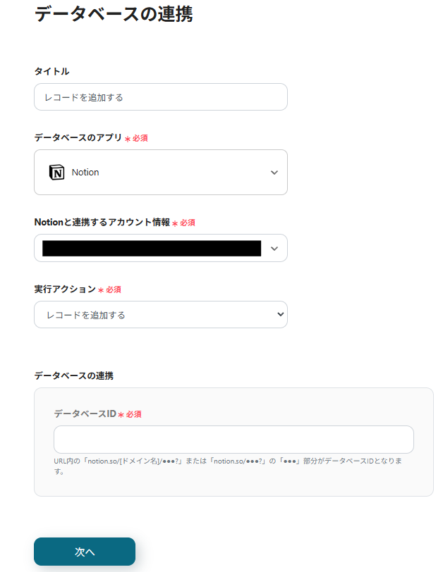 Notionのアクションを設定します。「レコードを追加する」をクリックしてください。