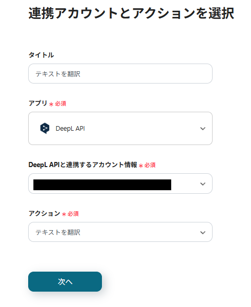 次に、DeepLのアクションを設定します。「テキスト翻訳」をクリックしてください。