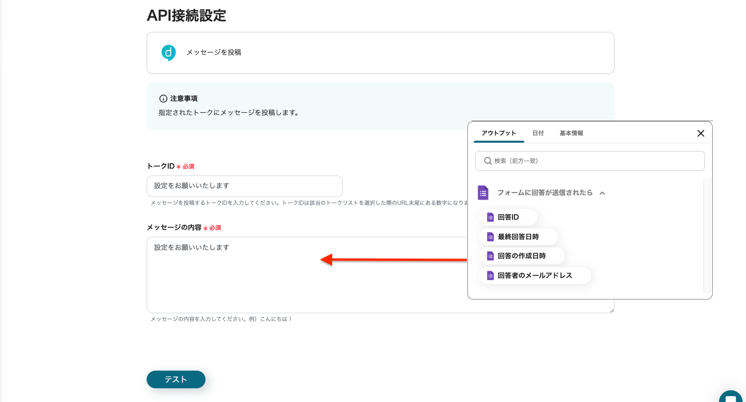 「トークID」には、注釈どおり、メッセージを投稿するトークIDを入力してください。
