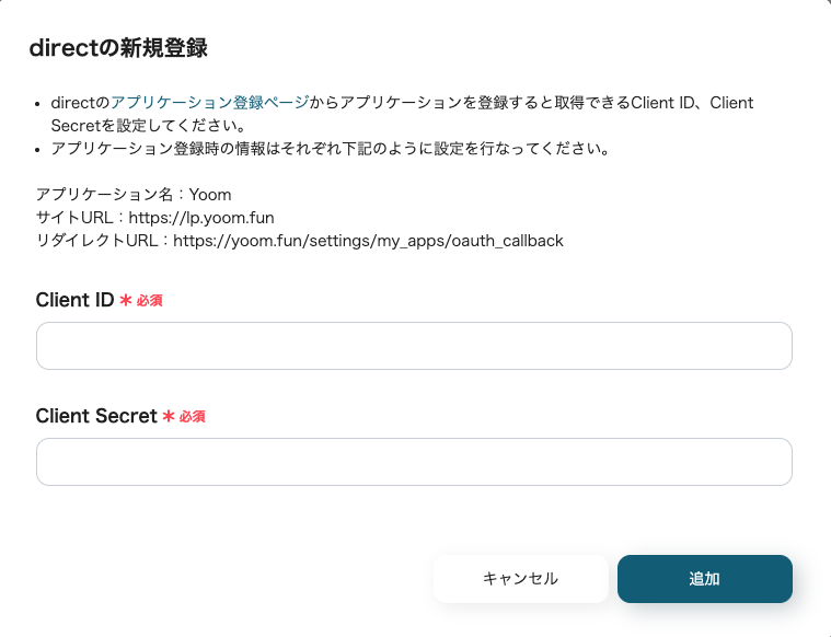 directでアプリケーション登録を行った後に取得できる、Client IDとClient Secretを各欄に入力してください。