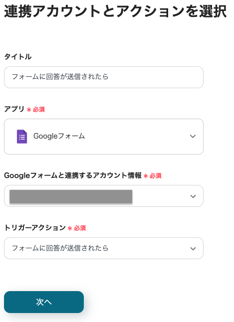 タイトルは編集可能ですが、トリガーアクションは変更せず「次へ」をクリックしてください。