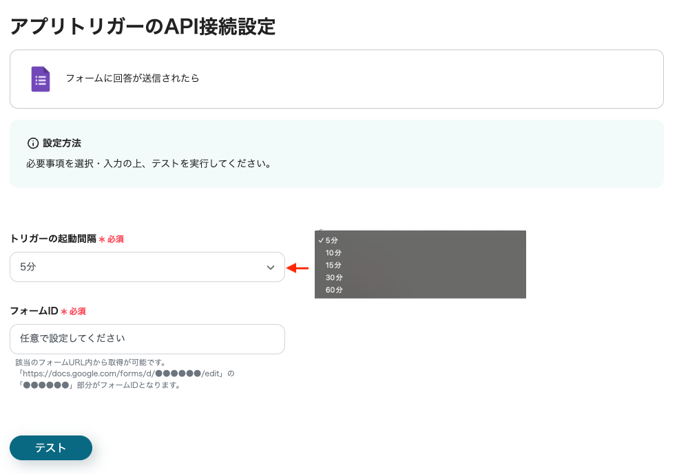 全て入力し終えたら、指定したフォームでテスト用の回答を送信し、「テスト」をクリックしてください。