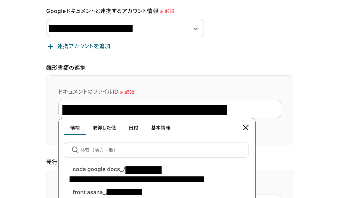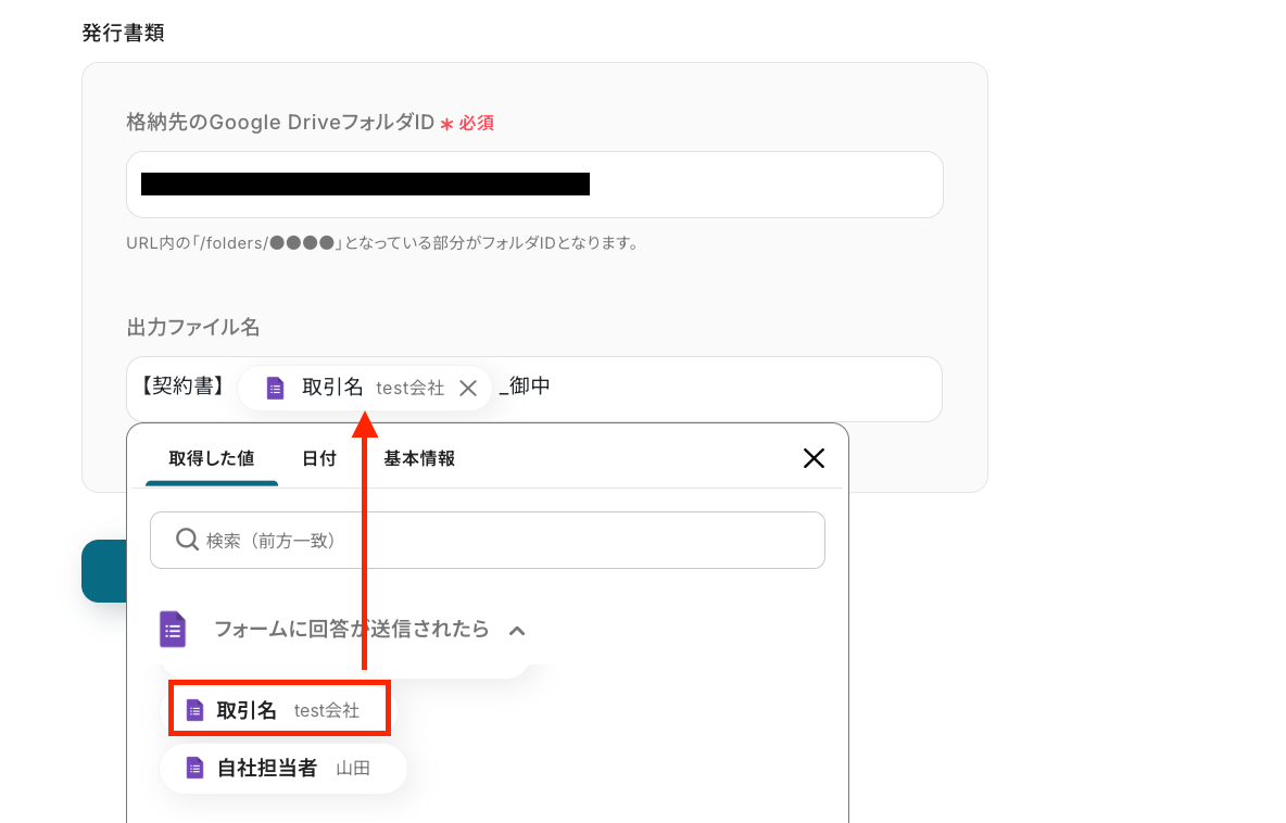 - 書類発行機能では、任意の雛形書類に、Googleフォームで取得した値を変数として埋め込めます。また、書類名や保存先のフォルダも自由に設定可能です。