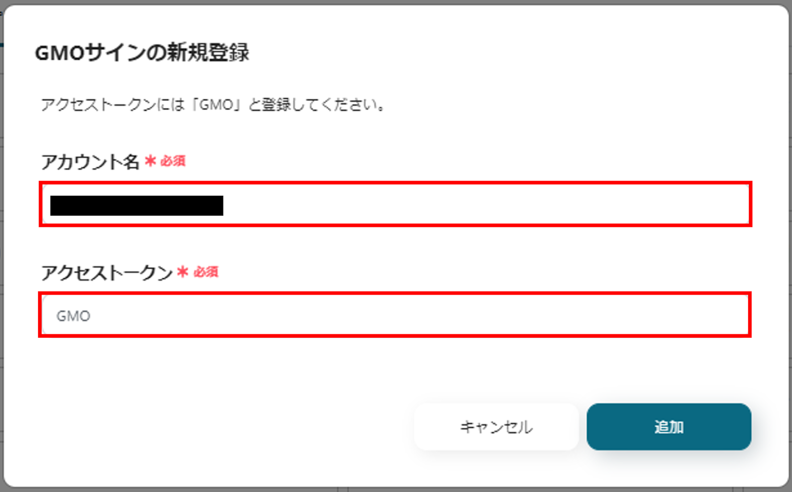(3) アクセストークンには、GMOを設定し、追加をクリック