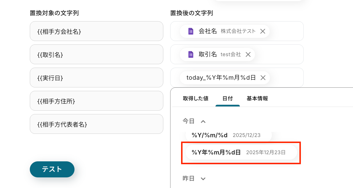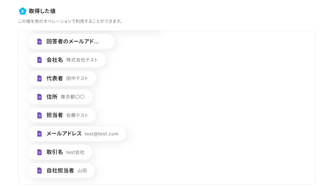 - 前のトリガーで設定したGoogleフォームの情報を『取得した値』から設定できます。