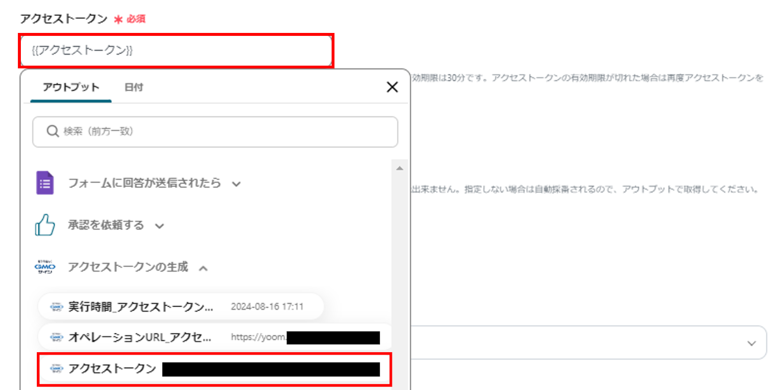 - 次に、オペレーションでGMOサインの「アクセストークンの生成」「封筒用文書の登録」を設定します。