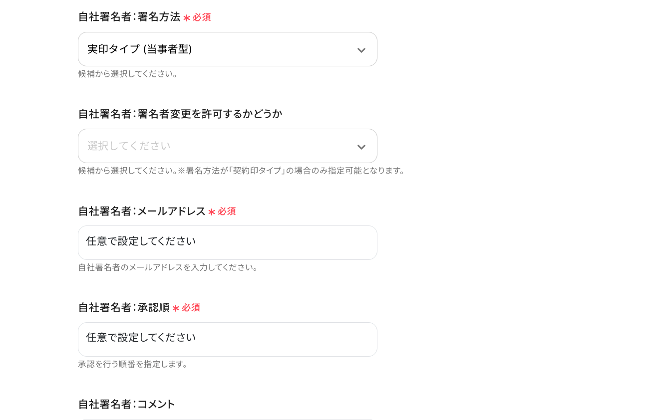 - GMOサインの各アクションでは、登録項目に固定値を設定したり、前段のフローで取得した値を変数として埋め込んだりといったカスタムができます。