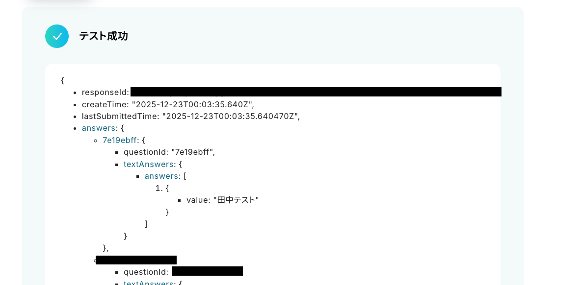 - Googleフォームをトリガーとして使用した際の回答内容を取得する方法は「Googleフォームトリガーで、回答内容を取得する方法」を参照ください。