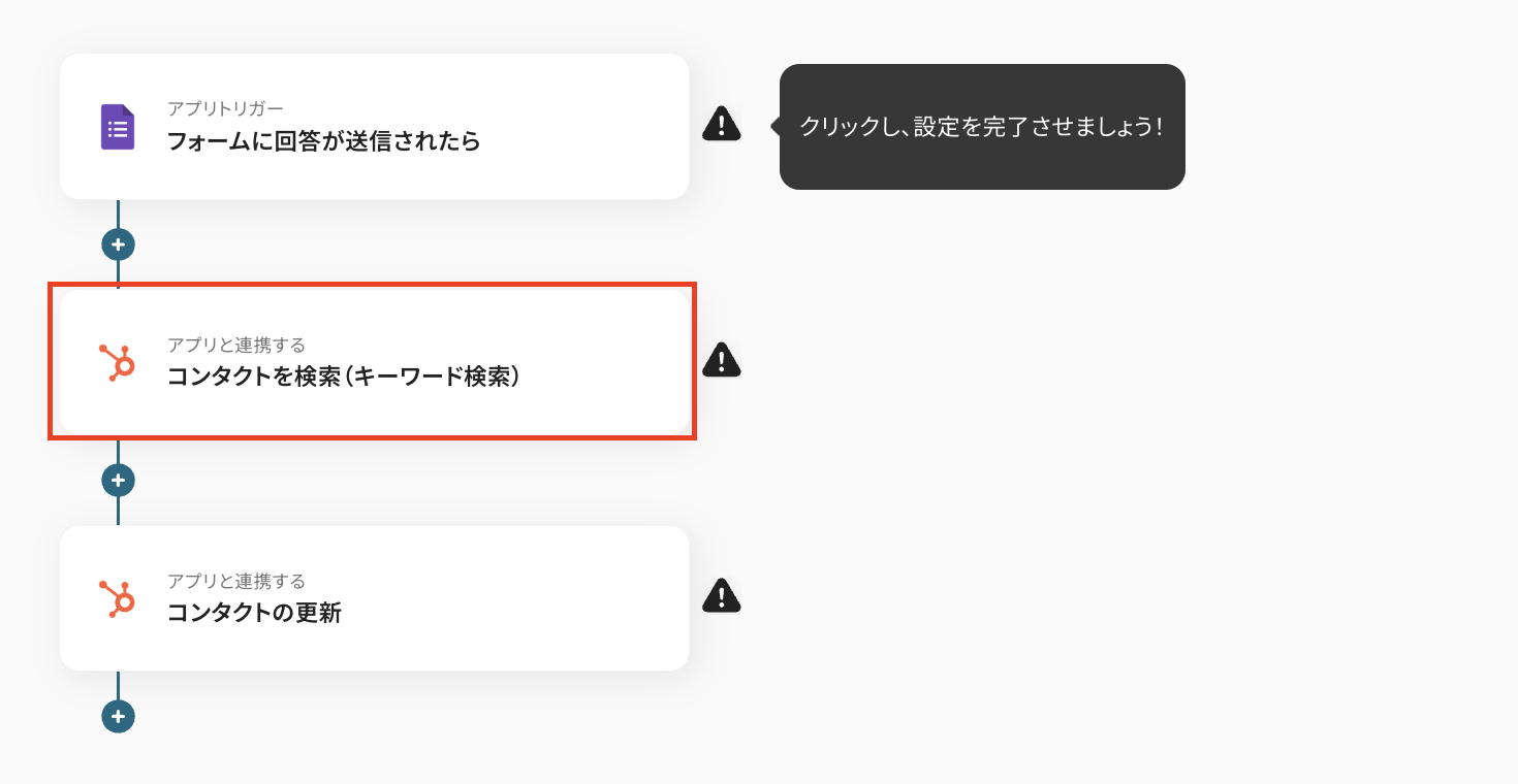 コピーが完了したら、ステップ1のGoogleフォームの設定までは同じステップになるので、そのあとのコンタクトを検索するHubSpotの設定から説明していきます。