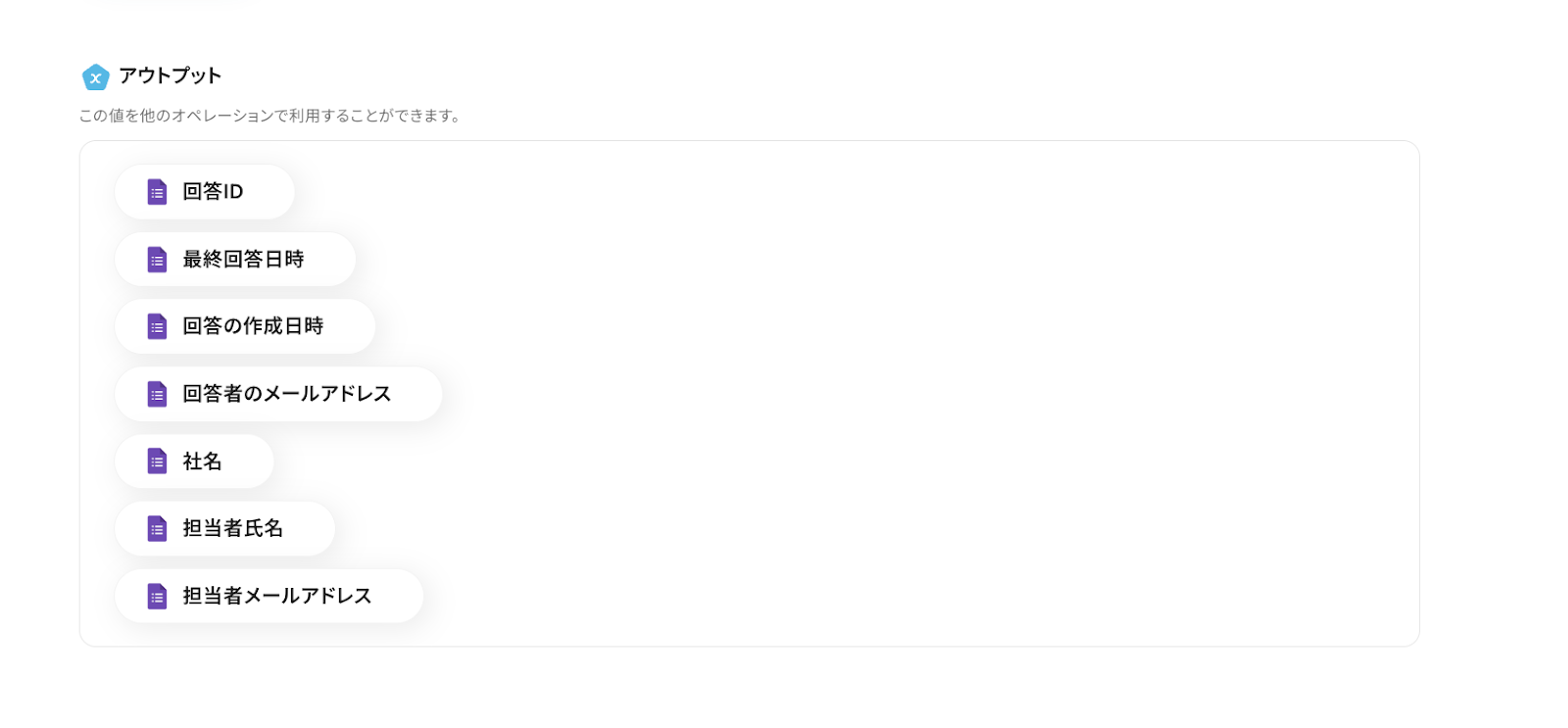アウトプット情報は、「この値を他のオペレーションで利用することができます。」という注釈の通り、この後のステップで引用・活用できます。