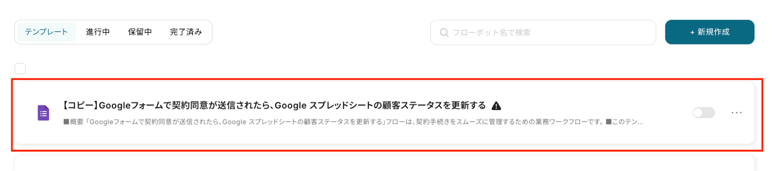それでは、さっそく「Googleフォームで契約同意が送信されたら、Google スプレッドシートの顧客ステータスを更新する」のテンプレートを使ったフローボットを作成していきましょう。