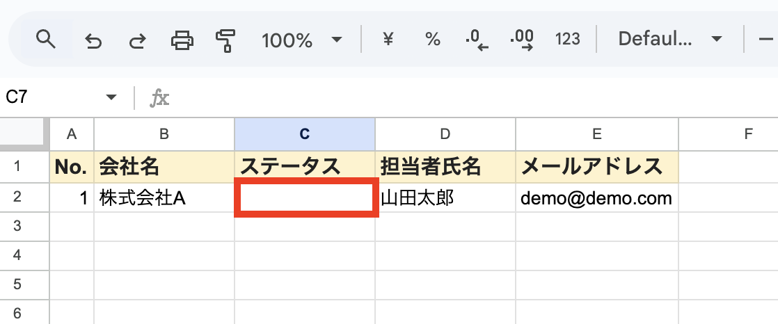 レコードを更新するGoogle スプレッドシートは、以下のような情報で構成しています。