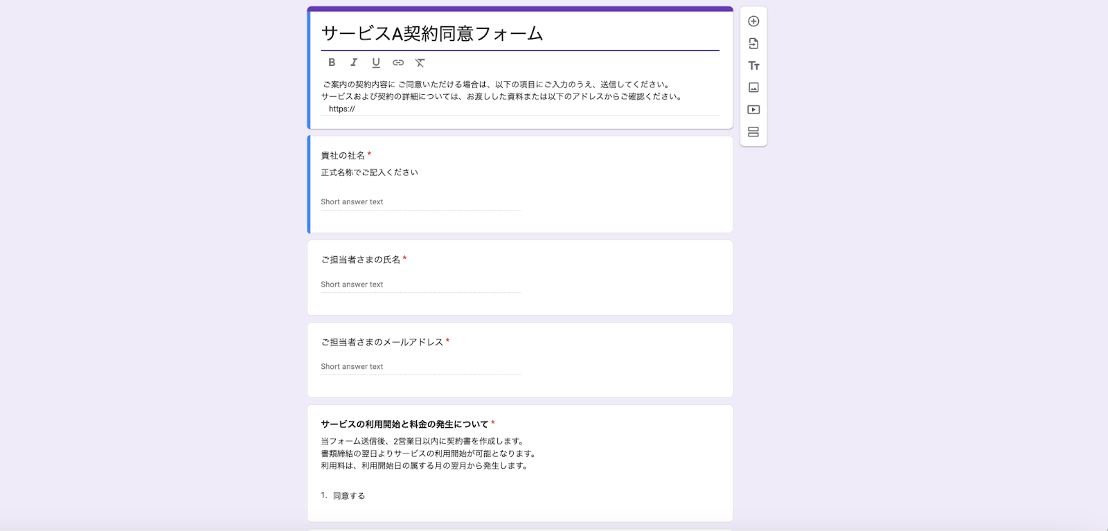 今回テスト用として、事前に以下のようなフォームを作成しています。