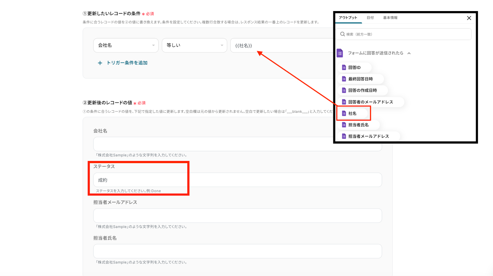 以下は例として、「①更新したいレコードの条件」へ、更新したいレコードに『会社名』を指定し、条件を『等しい』、条件と一致する情報を『社名』(アウトプット活用)と設定したものです。