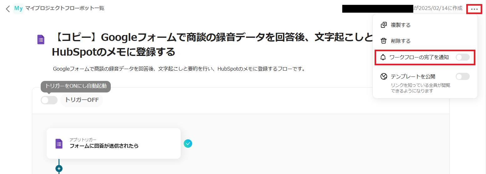 設定方法は、フローボットの設定画面で、右上の「・・・」をクリックし、「ワークフローの完了を通知」をONにすると完了です。