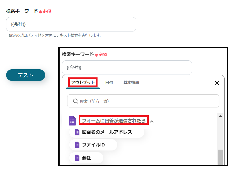 ※検索キーワードには、枠をクリックして表示されるアウトプットの「フォームに回答が送信されたら」からGoogleフォームに設置した会社名を設定します。(値は二重括弧で表示されます)