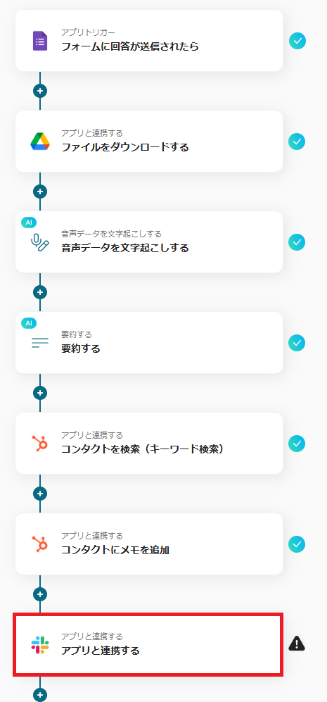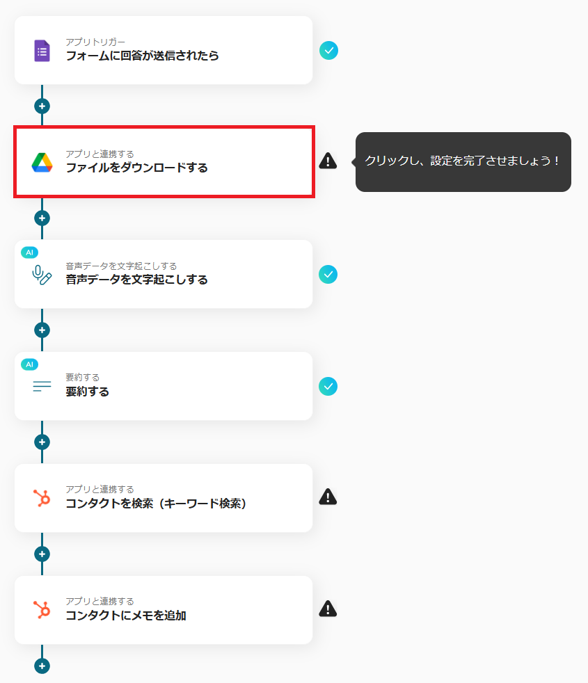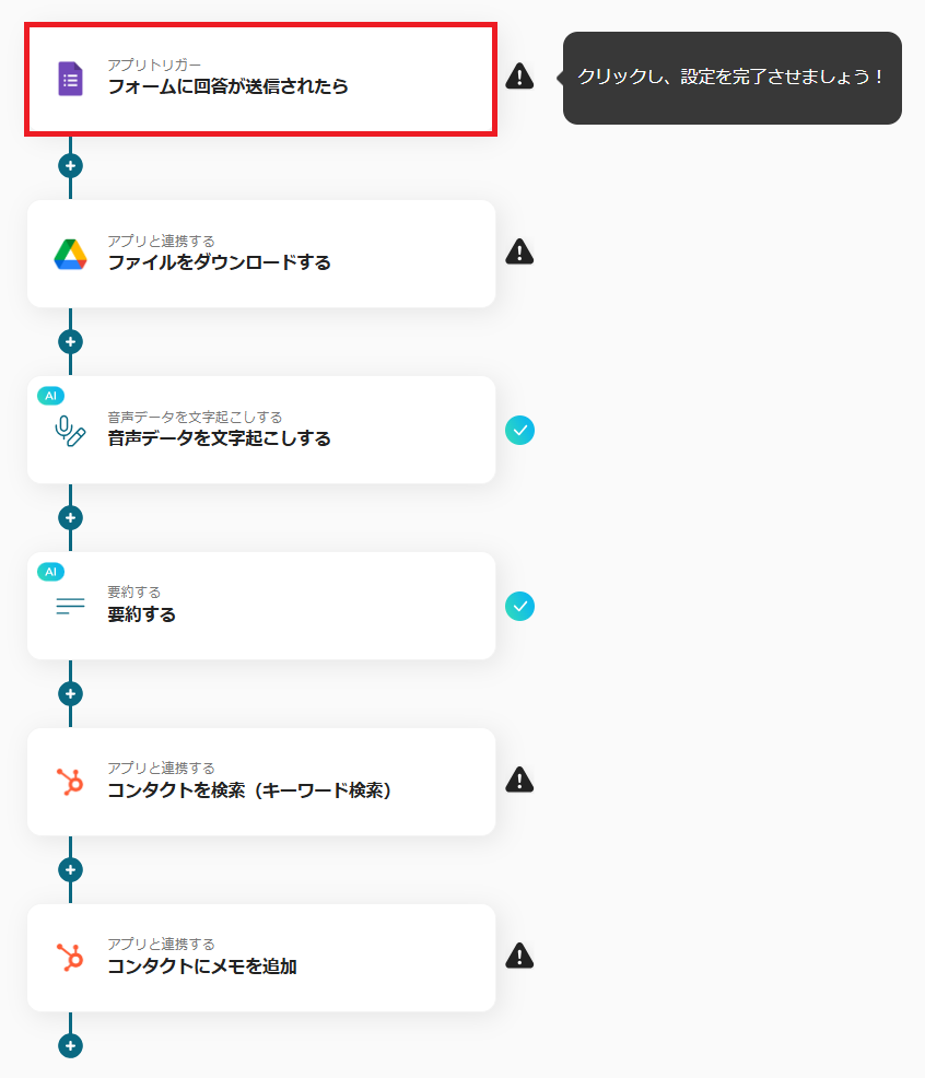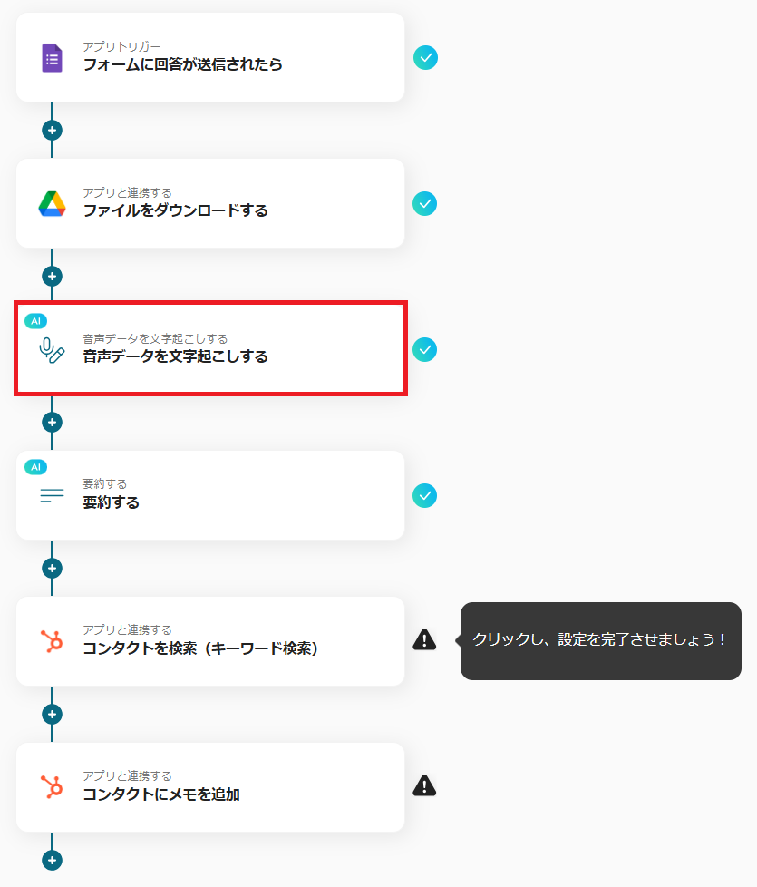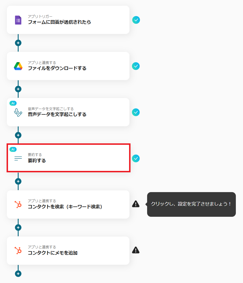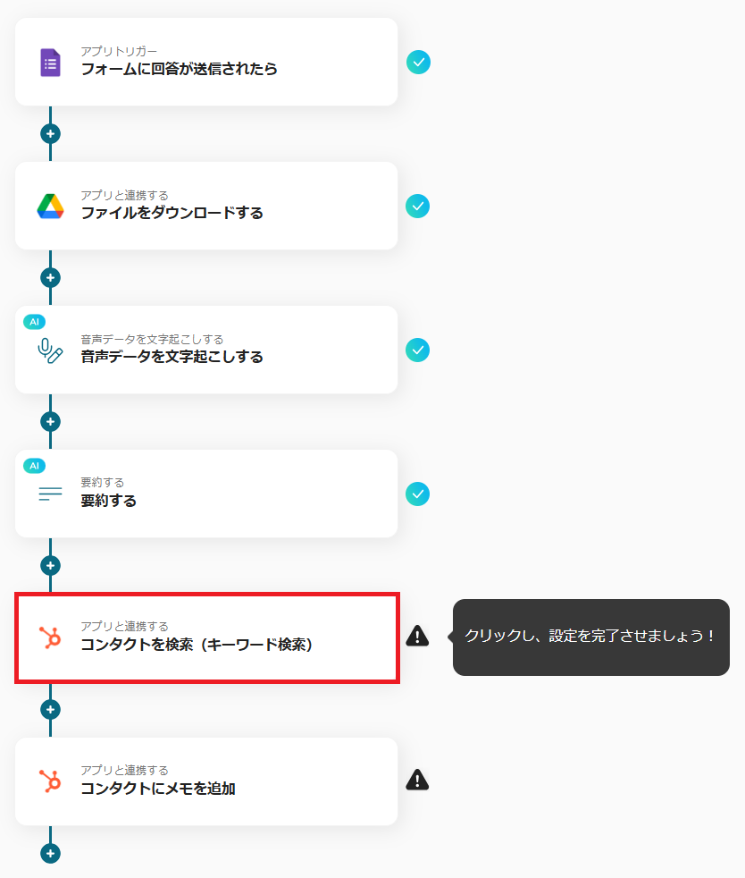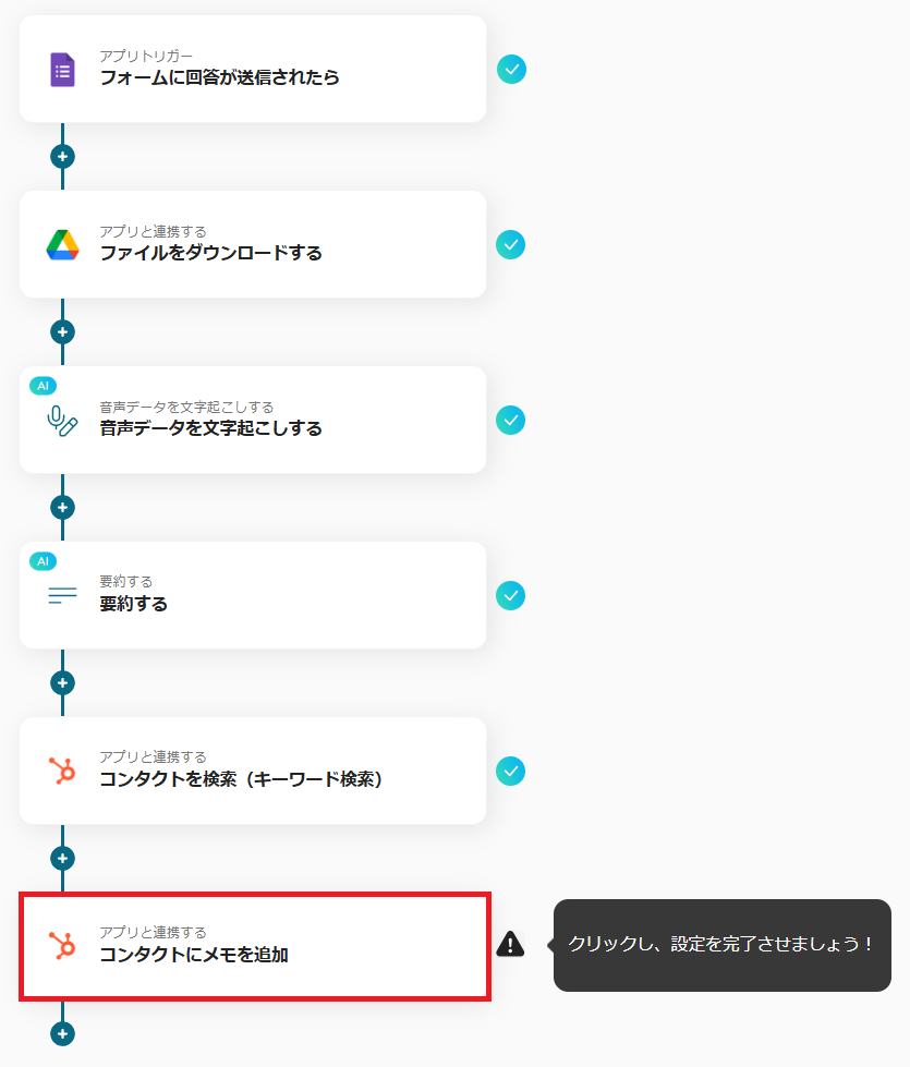 Googleフォーム、Google Drive、HubSpotを連携すれば、音声データを自動で要約して登録してくれるため、作業効率が向上するでしょう。