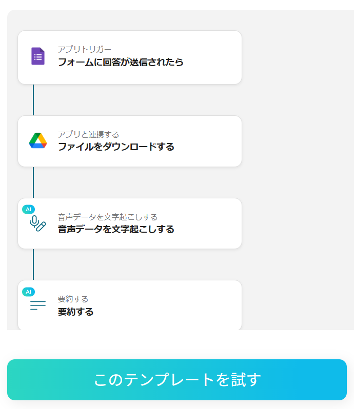 この方法は、GoogleフォームのAPIを利用して回答が送信されたことを受け取り、Google DriveのAPIを用いて録音データを取得した後、Yoomの文字起こし機能と要約機能を使って文章を作成することで実現可能です。