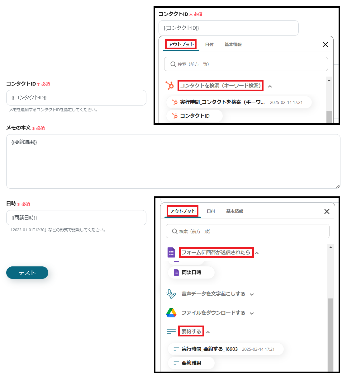 ※コンタクトIDは、枠をクリックして表示されるアウトプットの「コンタクトを検索(キーワード検索)」から設定します。(アウトプットを利用した値は、二重括弧で表示されます)