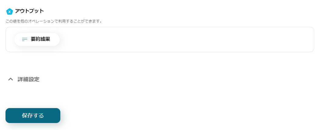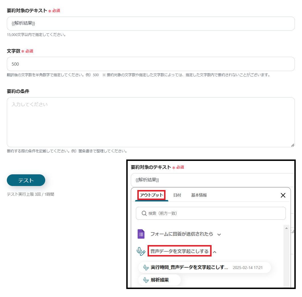 ※要約対象のテキストは、枠をクリックして表示されるアウトプットの「音声データを文字起こしする」から設定します。(値は二重括弧で表示されます)