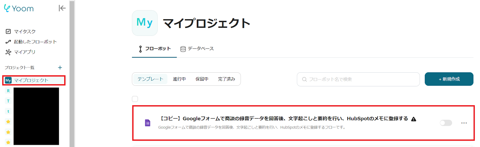 1.Yoom管理画面の「マイプロジェクト」を選択し、「【コピー】Googleフォームで商談の録音データを回答後、文字起こしと要約を行い、HubSpotのメモに登録する」をクリックします。