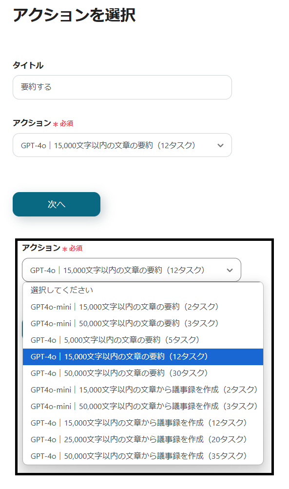 ※アクションは、ChatGPTのモデルや文字数の上限にあわせて変更できます。