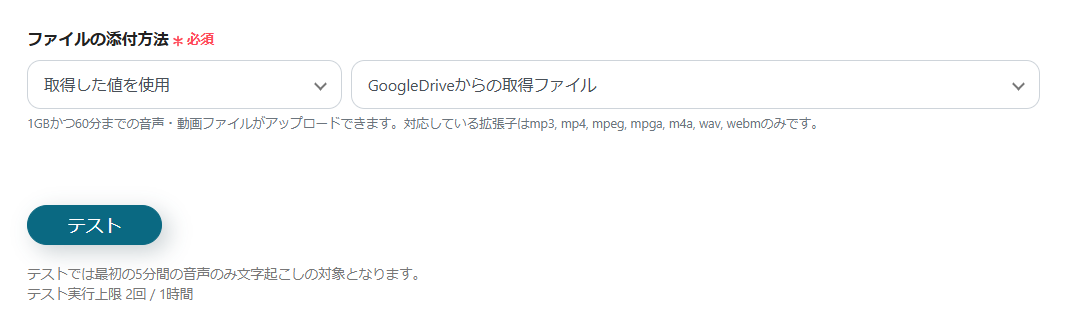 7.ファイルの添付方法を下記画像のように設定してテストを行います。