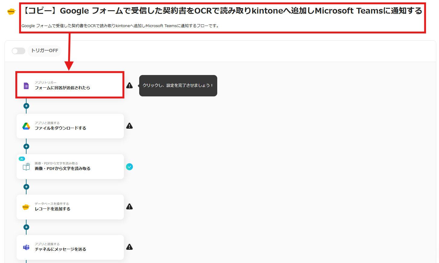 1.Googleフォームで受信した領収書をOCRで読み取り、kintoneへ追加し、Microsoft Teamsに自動通知するフローです。