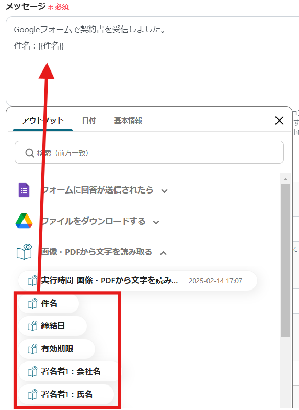 「画像・PDFから文字を読み取る」のアウトプットから通知したい項目を選択しましょう。