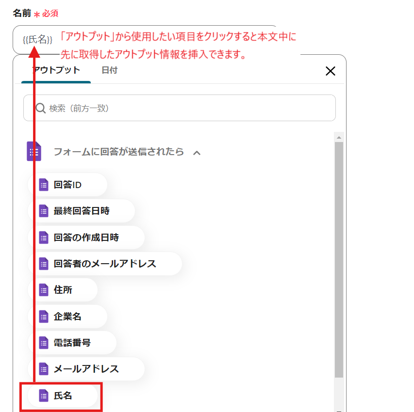 先に連携したGoogleフォームのアウトプット情報を引用できるので、候補から引用して入力してください。