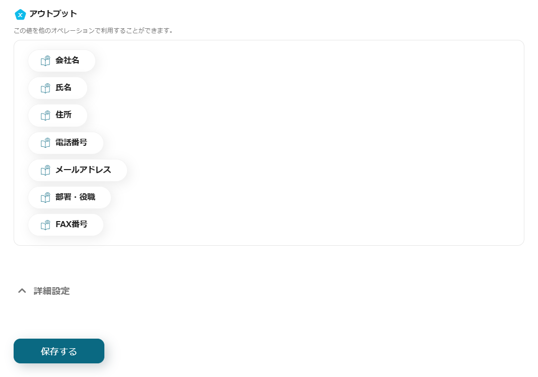 8.テストが成功すると、名刺から読み取った内容がアウトプットに追加されます。 問題がなければ保存します。